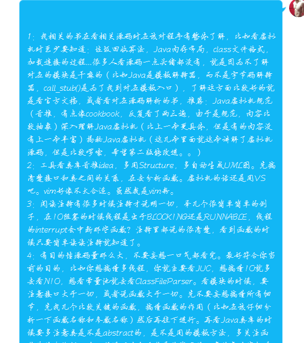 1:找相关的书在看相关源码时应该对程序有整体了解,比如看虚拟机时至少要知道:垃圾回收算法,Java内存布局,class文件格式,加载连接的过程...很多人看源码一点头绪都没有,就是因为不了解对应的模块是干嘛的(比如Ja