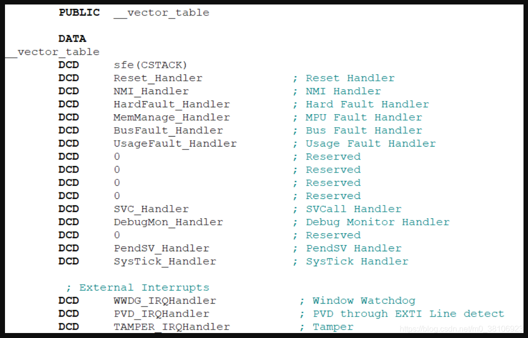 文件的开头定义了一个名为__vector_table的全局符号,“DATA”的作用是在代码段中定义一个数据区,用作向量表。数据区的内容是使用DCD指令定义的32位宽度常量,除了第一个sfe(CSTACK)比较特殊以为,其他的常量都是异常和中断服务程序的地址(在编译时函数名会被替换成函数的入口地址)。sfe(CSTACK)是IAR汇编器段操作,用于获取段(section)的结束地址,在这里意欲何为呢?