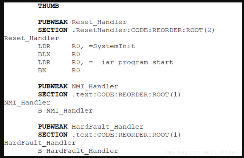 上面的THUMB命令表示接下来的代码采用THUMB模式(Cortex-M只支持Thumb-2指令集);SECTION用于定义一个段,段名为“.ResetHandler”,段的类型是代码(CODE);REODER指示用给定的名称开启一个新的段;ROOT指示链接器,当段内的符号没有被引用,链接器也不可以丢弃这个段。