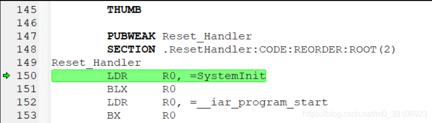 ystemInit函数是芯片厂商根据ARM的CMSIS标准提供的一个系统基础配置函数,配置基础的时钟系统和向量表重定位等。这里的LDR是伪指令,它将SystemInit函数的地址加载到寄存器R0,实际上是通过PC偏移寻址来获取SystemInit的地址。