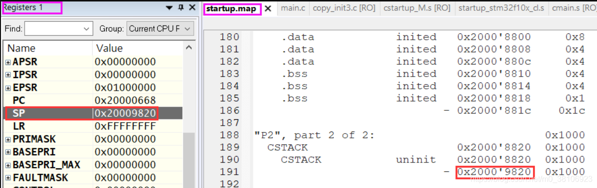此时,通过寄存器观察窗口查看SP的值为0x20009820。通过链接时生成的map文件,查看CSTACK的地址范围,0x20009820正好是CSTACK的结束地址。有了MSP,C代码就能运行了。