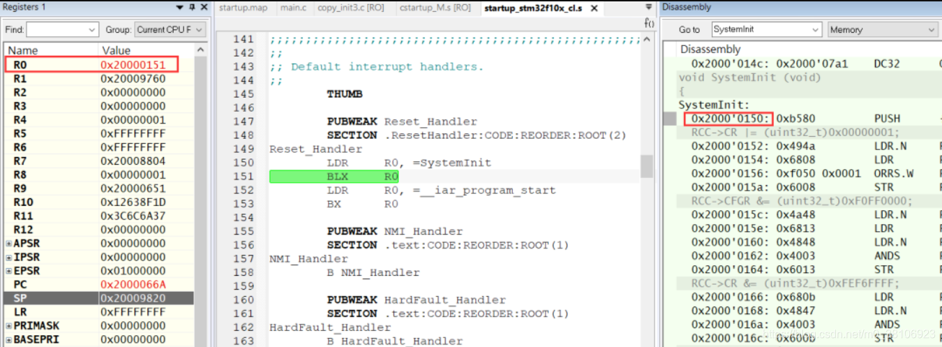 从上面的图可以发现一个问题,在反汇编窗口可以观察到SystemInit的地址是0x20000150,但加载到R0寄存器后却是0x20000151。这是因为在使用跳转指令更新PC时,需要置PC的LSB为1,以表示THUMB模式,由于Cortex-M不支持ARM模式,因此LSB总是1。