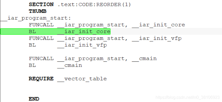 __iar_program_start首先会执行两个函数:__iar_init_core和__iar_init_vfp,可以完成一些CPU和FPU相关的初始化操作,在某些ARM架构打包好的运行时库会有这两个函数,用户也可以重写这两个函数来自己实现一些相关的操作。