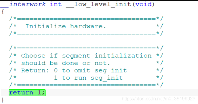 __low_level_init可以在任意的C文件中编写,注意它的返回值,如果返回0,后续就会跳过变量初始化操作,正常一般都是返回1。