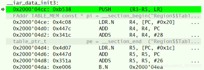 此后进入到__iar_data_init3函数,在这里会完成所有具有初始值的全局/静态变量的赋值,以及零初始化全局/静态变量的清零操作,分别调用__iar_copy_init3和__iar_zero_init3,将保存在ROM区由链接器生成的变量初始值复制到变量的地址。注意,新的EWARM版本默认变量初始化操作可能会采用压缩算法,实际变量初始化调用的函数可能有区别。