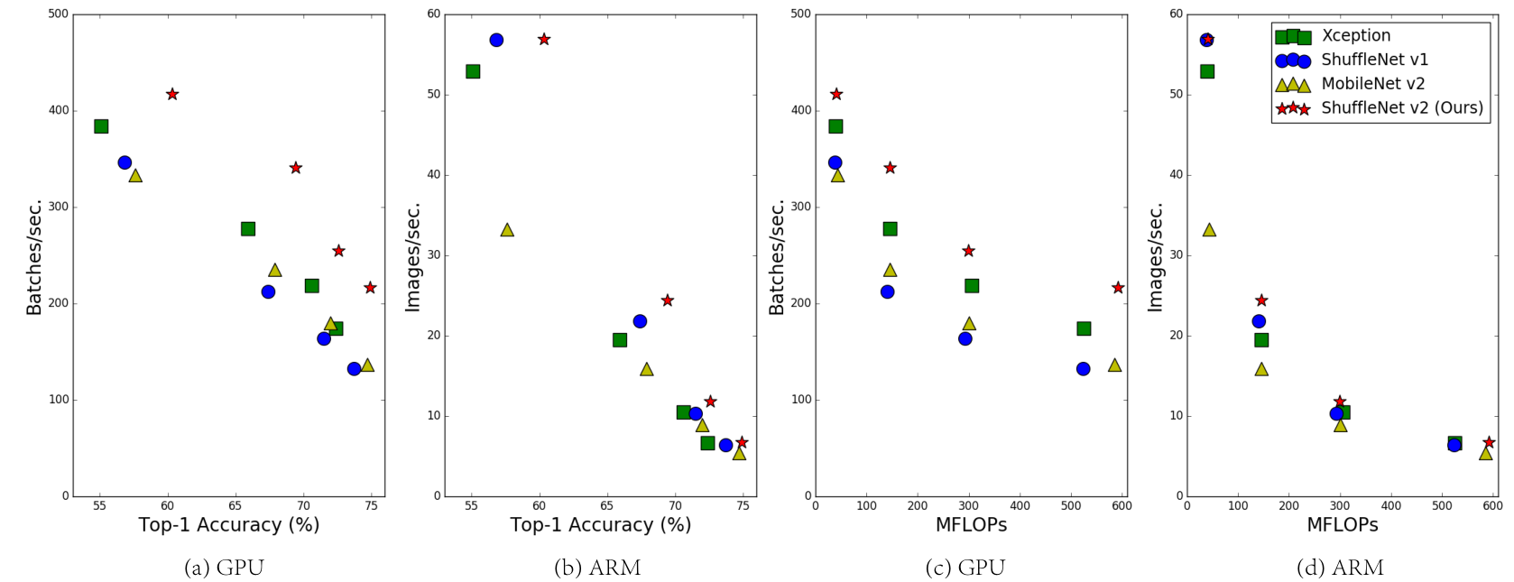 (a,c)GPU结果,batchsize= 8.(b,d)ARM结果,batchsize= 1。在所有情况下,性能最佳的算法,即论文提出的ShuffleNetv2(位于右上角区域)的准确度、复杂度都有明显提高。