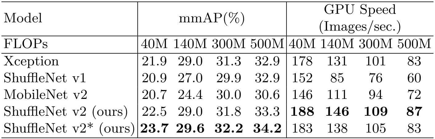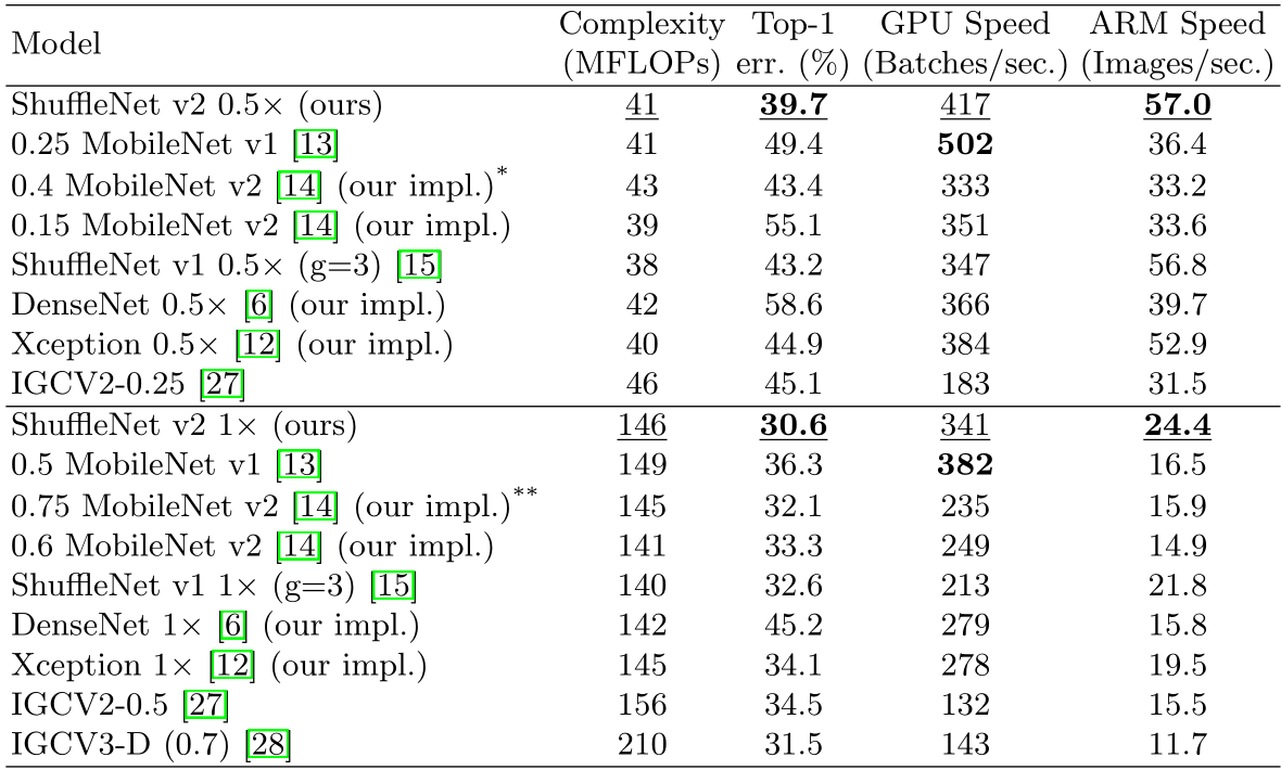 比如ShuffleNetv2的0.5的复杂度,MFLOPS=41M、GPU平台上单位秒处理数=417张图片、ARM平台上单位秒处理数=57张图片。