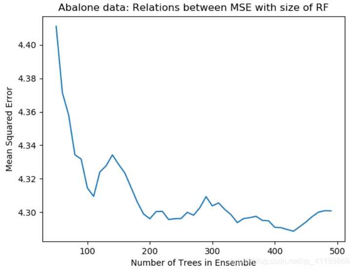 for iTrees in nTreeList: depth = None abaloneRFModel = ensemble.RandomForestRegr...