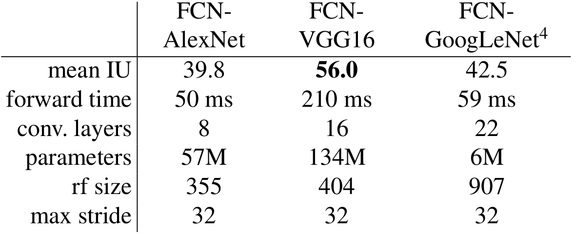 | FCN的基础CNN网络可以采用AlexNet、VGG16、GoogleNet等经典架构。 FCN的mean IU是最高的但是foreard time处理时间较长且conv.ayer的复杂度较高。 |