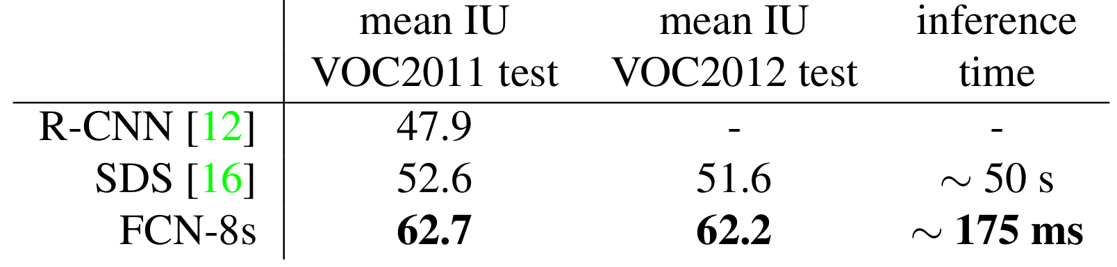 | 比较R-CNN和FCN-8s的测试时间,其中FCN-8s的mean IU高于其他两个网络。 | ![]() |