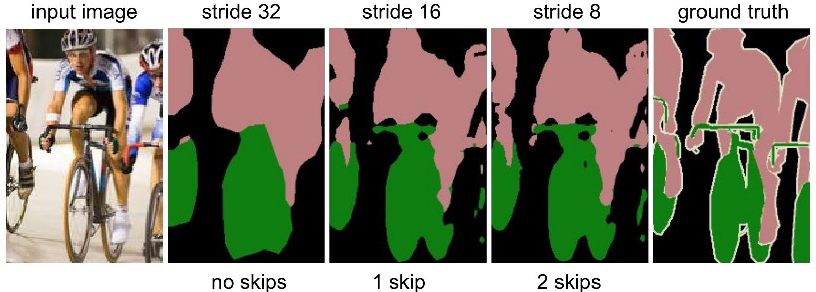 第一张图没有采用跨层连接,即no skips(stride=32)分割的FCN,就比较粗糙了;第二张图采用skip=1的跨层连接(stride=16)的FCN有点改善了;第三张图采用skip=2的跨层连接的FCN效果更好一些。