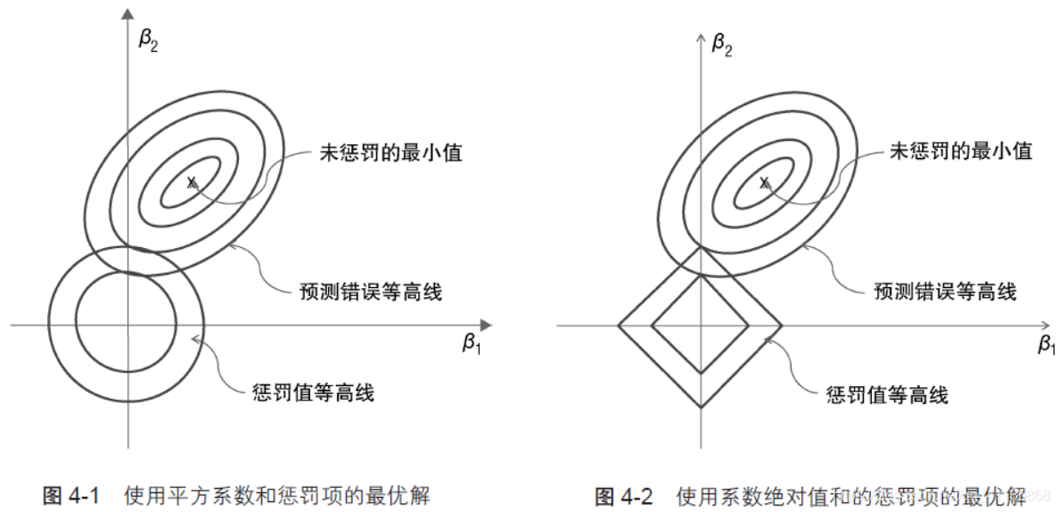 图4-1 及图4-2 的曲线集合代表RiR公式和Lasso回归公式的系数惩罚项,分别是岭惩罚项和套索惩罚项。在图4-1 中,代表系数惩罚项的曲线是以原点为中心的圆。平方和等于常量,限定了β1 以及β2 是位于圆上的点。常数惩罚项的曲线形状由使用的距离性质决定:基于平方和的惩罚项对应于圆(称作超球面或者高维空间的I2 球面),基于绝对值和的惩罚项对应于菱形(或者l1 球面)。小的圆(或者菱形)对应于较小的距离函数。形状虽然由惩罚函数的性质决定,但是每条曲线关联的值由非负参数λ 来决定。假设图4-1 中的2 条曲线分别对应平方和(β1、β2)为1.0 和2.0 的情况。如果λ =1,那么和2 个圆圈关联的惩罚项为1 和2。如果λ =10,那么关联的惩罚项为10 和20。图4-2 中的菱形结果也相同。增加λ 也会增加与图4-2 相关的惩罚项。