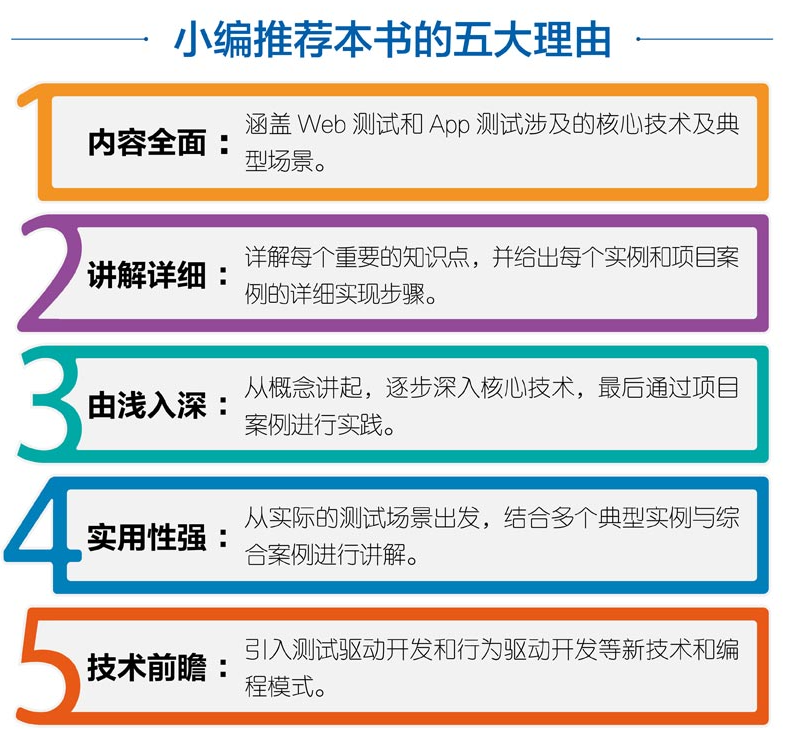 《Python自动化测试入门与进阶实战》共10章,分为2篇。第1篇“Python自动化测试基础”,涵盖的主要内容有自动化测试概述、Python HTTP接口编程、Selenium基础知识、Python模拟数据测试、Python爬虫测试接口、性能测试、App自动化测试及pytest单元测试;第2篇“Python自动化测试实战”,涵盖的主要内容有基于RESTful API的自动化测试案例,以及基于Selenium的Web自动化测试案例。