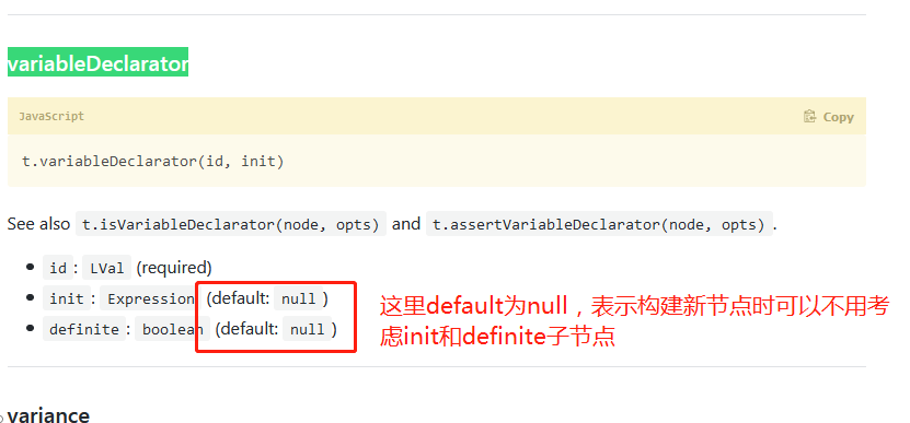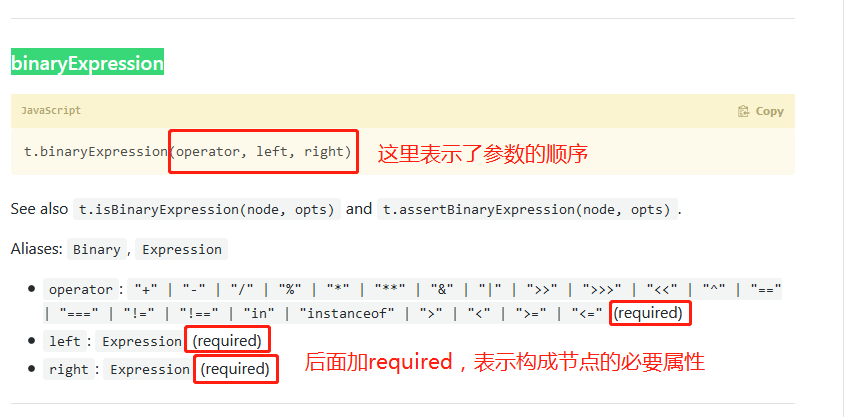上面的 t.binaryExpression(operator, left, right) 表示出了参数的顺序,下面的 子节点后面跟 required,则表示构成节点的必备属性。
