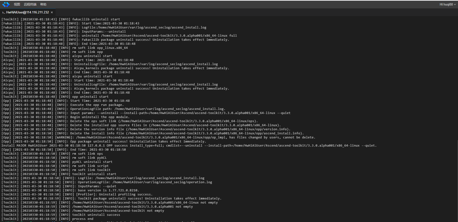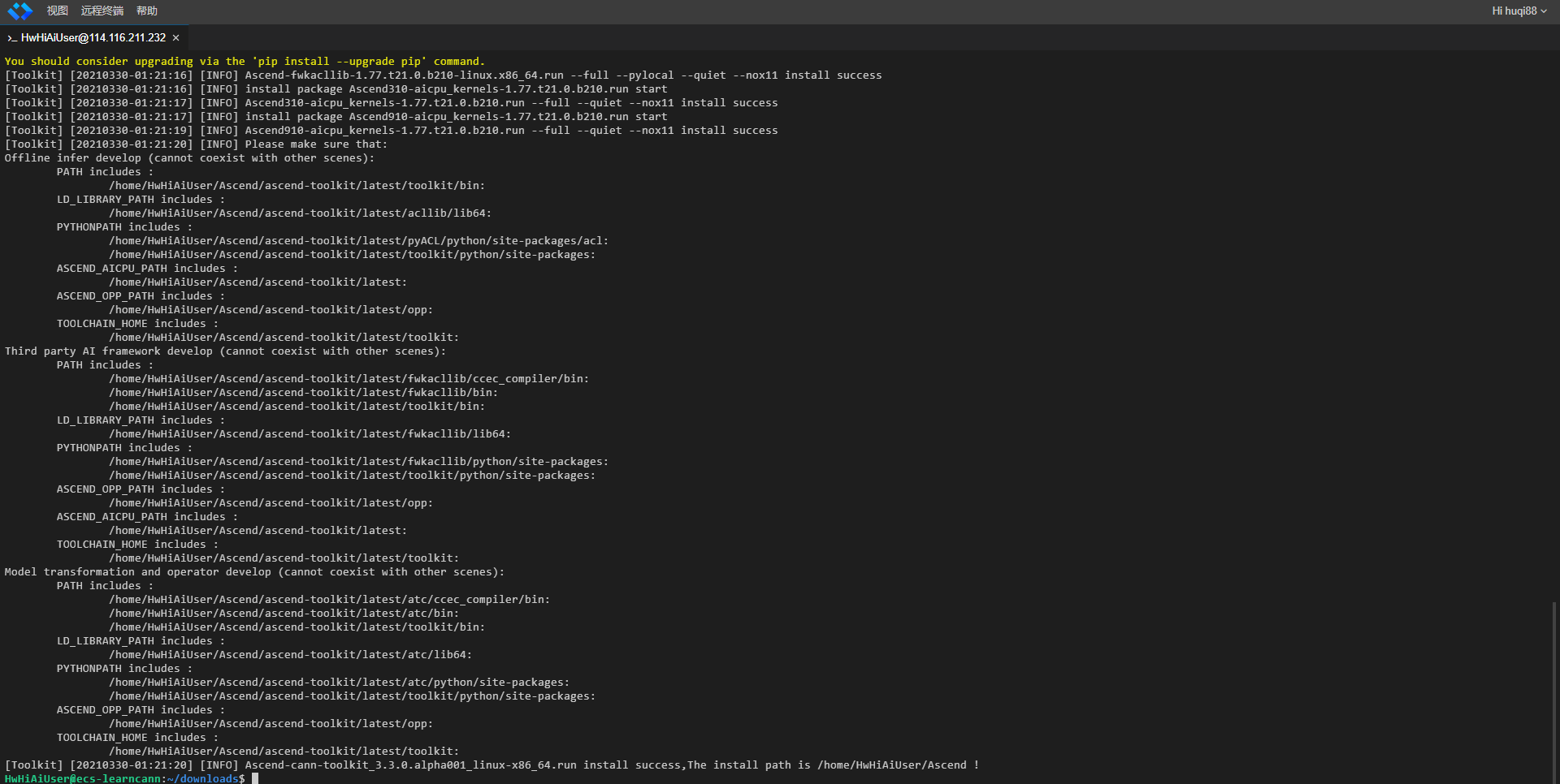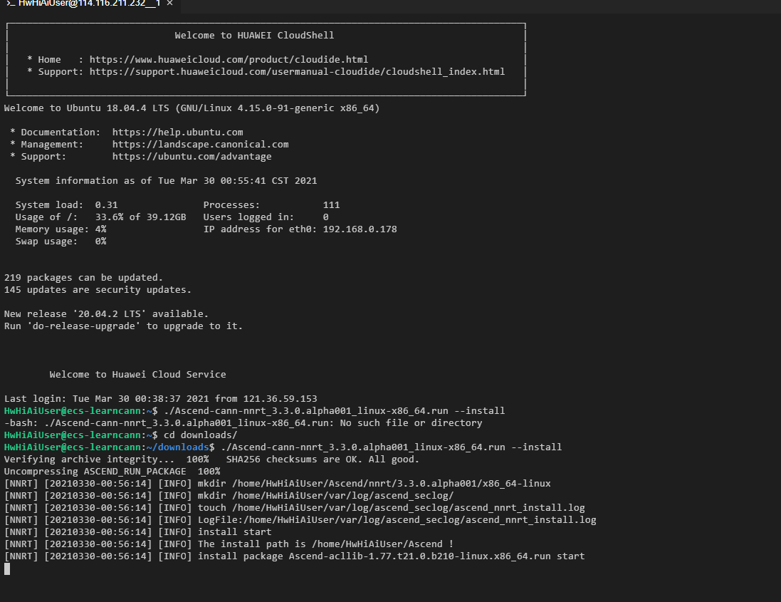 [NNRT] [20210330-00:56:17] [INFO] Ascend-cann-nnrt_3.3.0.alpha001_linux-x86_64.run install success,The install path is /home/HwHiAiUser/Ascend !