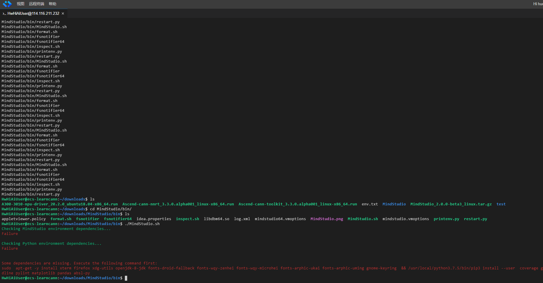 遇到错误按照提示操作,先用root权限安装写apt依赖;再用HwHiAiUser安装python依赖。