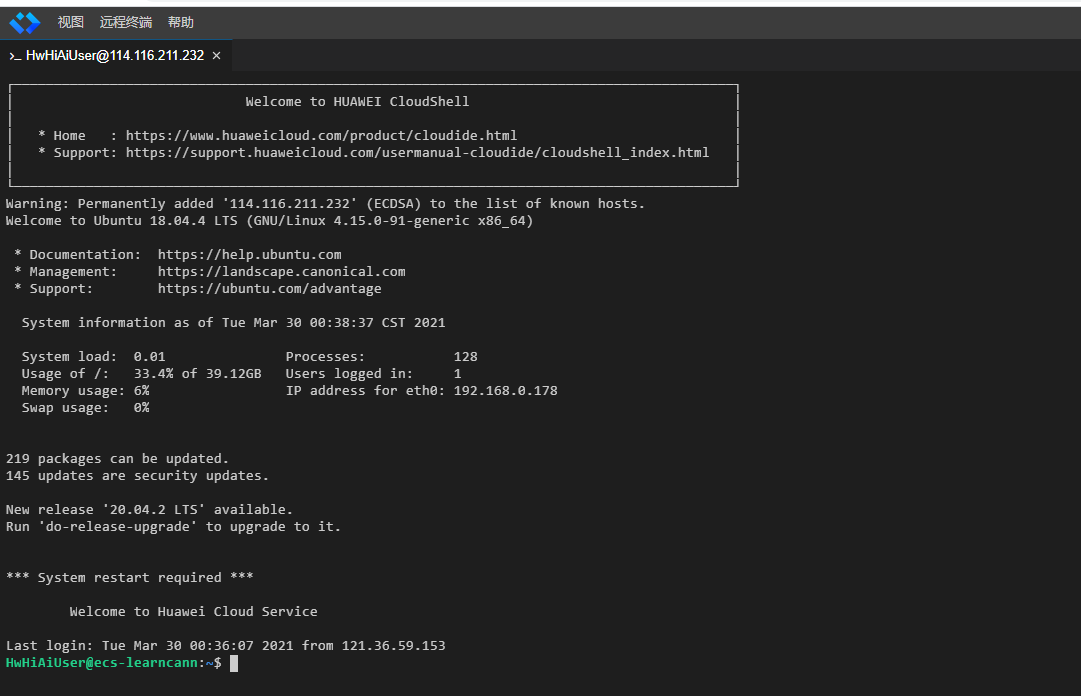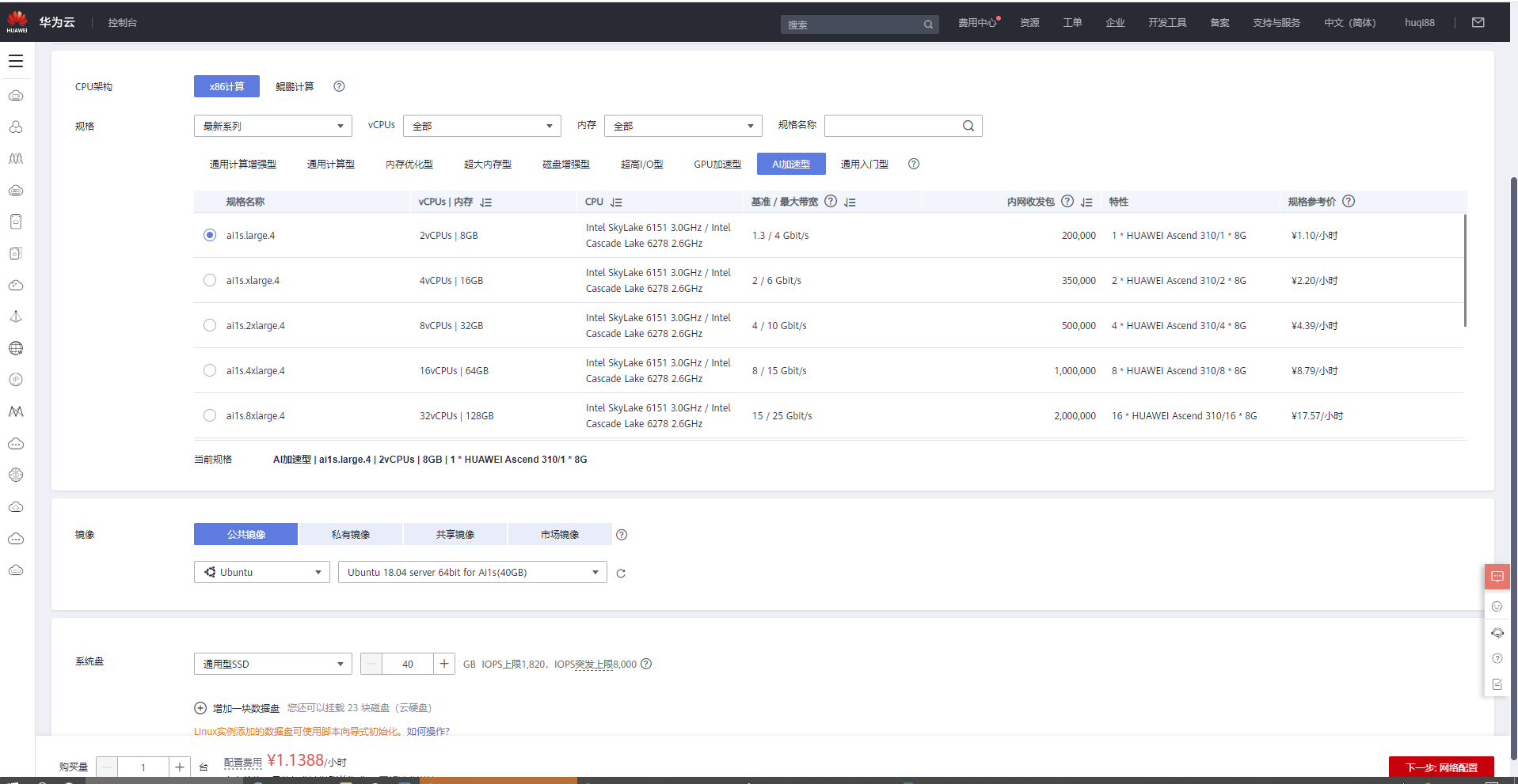 值得留意的是规格选 AI加速型,AI加速型实例提供AI芯片,主要用于机器视觉、图像分类、语音识别等AI推理场景,此次用单片的 Ascend 310;系统选用的Ubuntu 18.04 server 64bit for Ai1s(40GB),当然还需绑定一个公网IP,让我们在本地通终端工具能够访问到ECS。