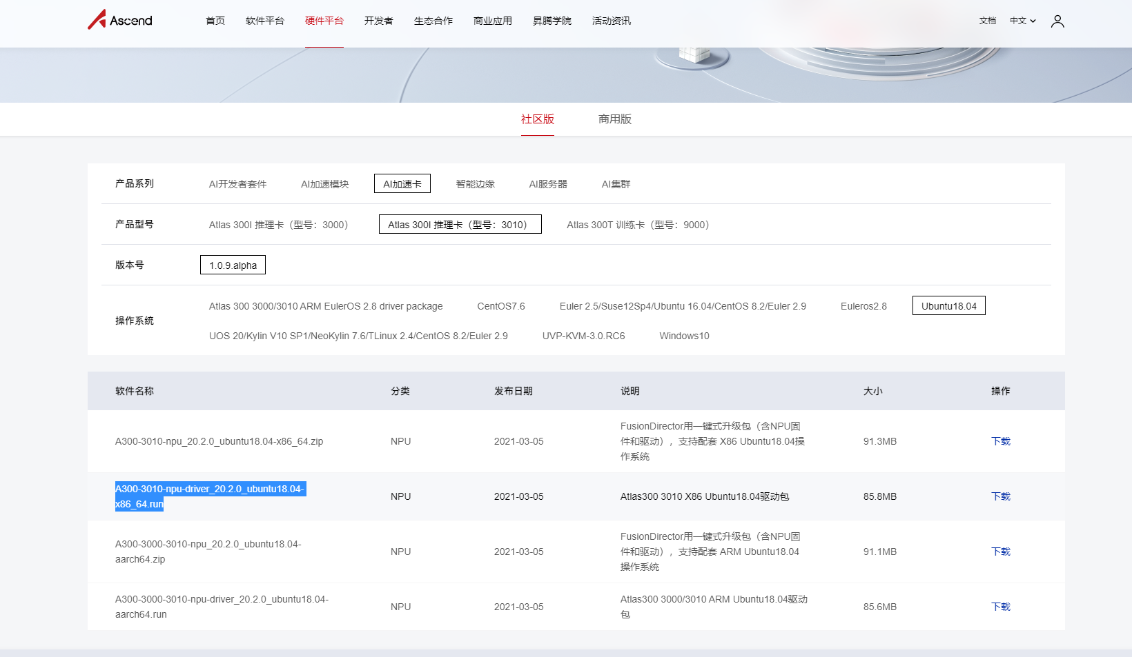 上文我们已经选用了昇腾310的环境,因此我们需要按照场景二来安装环境。 驱动选用的是Atlas300 3010 X86 Ubuntu18.04驱动包。