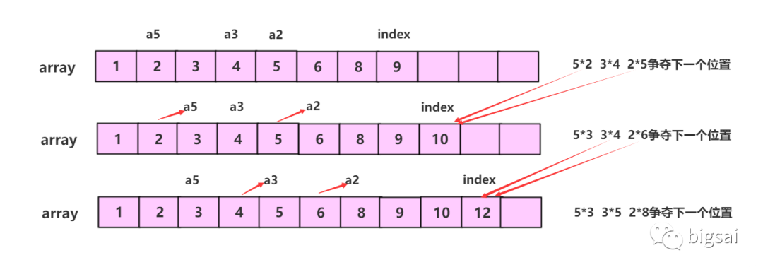 简单来说就是用了三个光标,a2,a3,a5.每次比较三个位置分别*2,*3,*5谁最小,然后对应光标往右移动一位。!到结束即可!