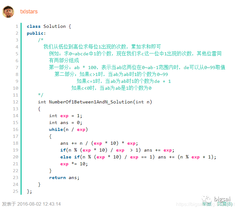 求出1~ 13的整数中1出现的次数,并算出100~ 1300的整数中1出现的次数?为此他特别数了一下1~13中包含1的数字有1、10、11、12、13因此共出现6次,但是对于后面问题他就没辙了。ACMer希望你们帮帮他,并把问题更加普遍化,可以很快的求出任意非负整数区间中1出现的次数(从1 到 n 中1出现的次数)。