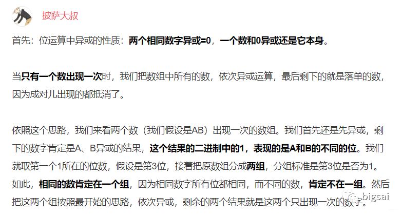 就是说先异或到最后得到一个数,肯定是a^b的值。这个数位位1的那个肯定就是两个位不同的。比如10100.第三位就是a和b不同的,然后我们就再次遍历所有数,用两个数进行异或,如果第三位为1xx那么和a1异或,如果为0xx那么和a2异或。就相当于把这个数逻辑一分为2.因为所有数除了这两都出现两次,所以是可以消下去的!