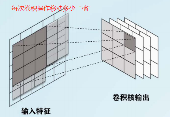 - 卷积核步长:卷积核在长度方向核宽度方向上每次一点的距离。比如:步长为1,每次移动一格;步长为3,每次移动三格;