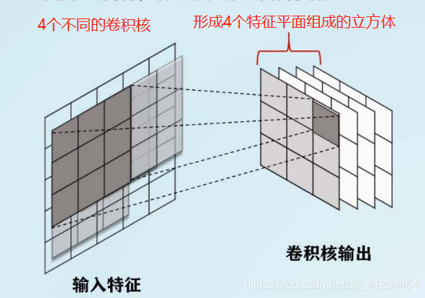 一个卷积核提取到的特征对应一个通道(上图:二维矩阵),不同卷积核得到的特征进行堆叠,形成具有多个不同通道的特征立方体。