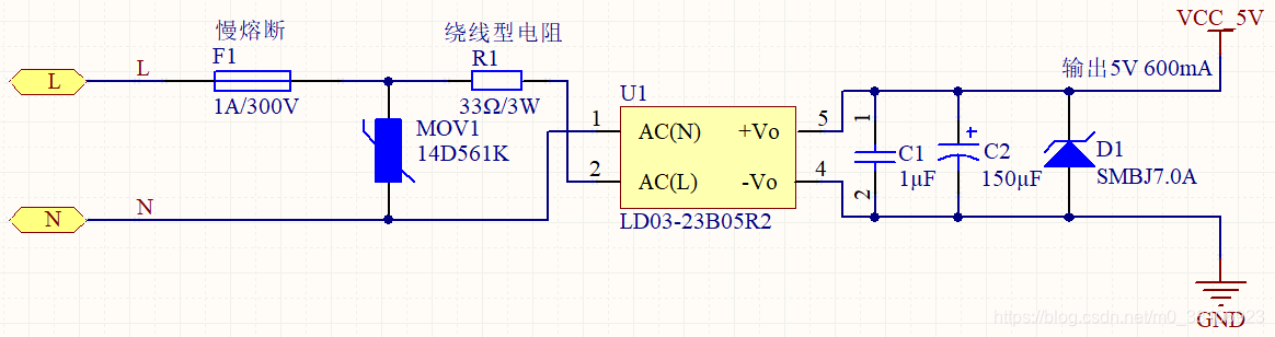 AC 220V转DC 5V电源选用金升阳的LD03-23B05R2模块,该电源模块可输出电压/电流:5V/600mA(驱动MCU、继电器以及其他外设最大消耗电流200mA,驱动WiFi芯片最大消耗电流350mA)具有低功耗、高效率、高可靠性、安全隔离等优点。产品安全可靠,EMC 性能好。