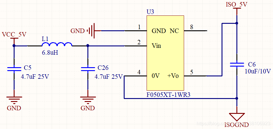 DC 5V转DC 5V电源主要是为了将交流地和直流地隔离,减少电源干扰,保护系统的安全。该部分电源选用金升阳的F0505XT-1WR3模块,可保持5V/200mA电源稳定转换,驱动的电耗采集模块最大消耗电流不超过100mA,可满足使用。