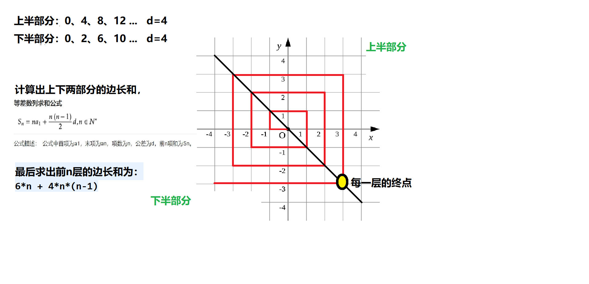 我们仔细观察这个图形其实就可以发现,它的“右上部分”和“左下部分”是相似对称的,如果我们给图形从中间画一条“\”的斜线进行平均分割,然后单独观察每一部分,其实就可以发现,每一层的边长其实就是一个等差数列,那么我们就可以定义一个顶点作为每一层折线的终点,那么我们可以根据输入的坐标,推出该坐标拥有几层正方形,该坐标距离终点相差多少,然后用完整的层数的边长总和减去相差的边长,即可得到结果。具体的解释可以看下图: