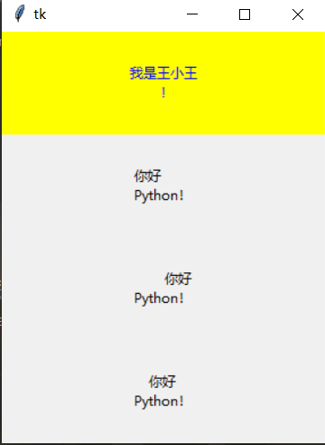 label1=tkinter.Label(root, # anchor=tkinter.E,#设置标签文本位置 bg="yellow",#设置标签的背景色 fg="blue",#设置标签的前景色 text="我是王小王\n!",#设置标签显示的文本 justify=tkinter.CENTER, width=40,#设置标签宽度 height=5#设置标签高度 )
