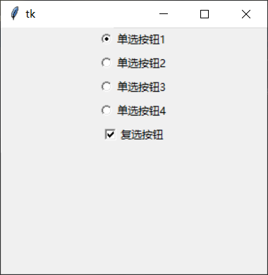 radio=tkinter.Radiobutton(root, variable=r, value="4",#设置单选按钮时的变量值 text="单选按钮4", )