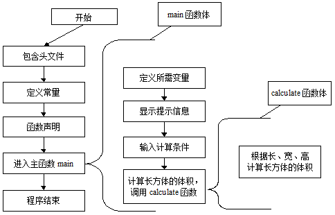 | (5)在main函数中,首先定义3个整型变量,3个变量分别代表着长方体的长度、宽度和长方体的体积。 |