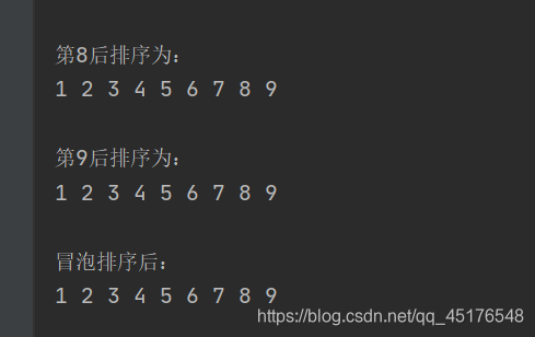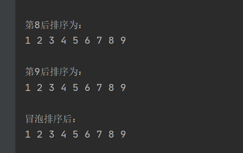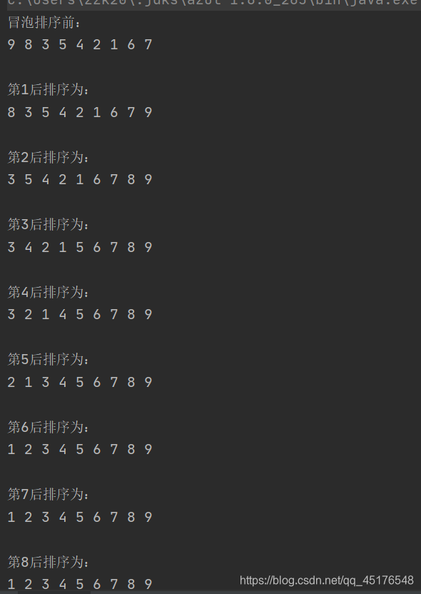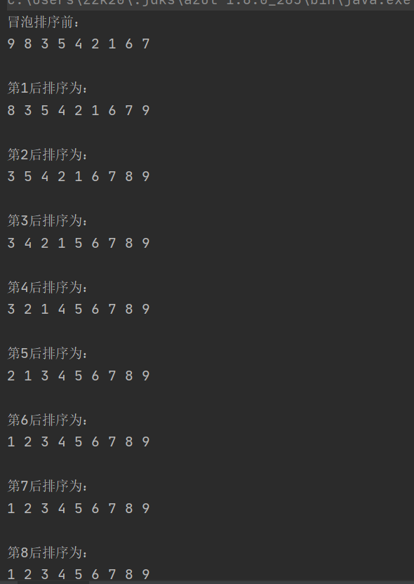 System.out.print("第"+(i+1)+"后排序为:"+"\n");