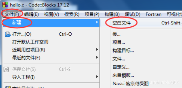 打开 CodeBlocks ,在上方菜单栏中选择 “文件 --> 新建 --> 空白文件”,如下图所示: