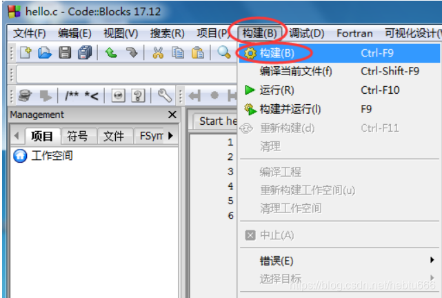 在上方菜单栏中选择 构建 --> 构建,就可以完成 hello.c 的编译工作。