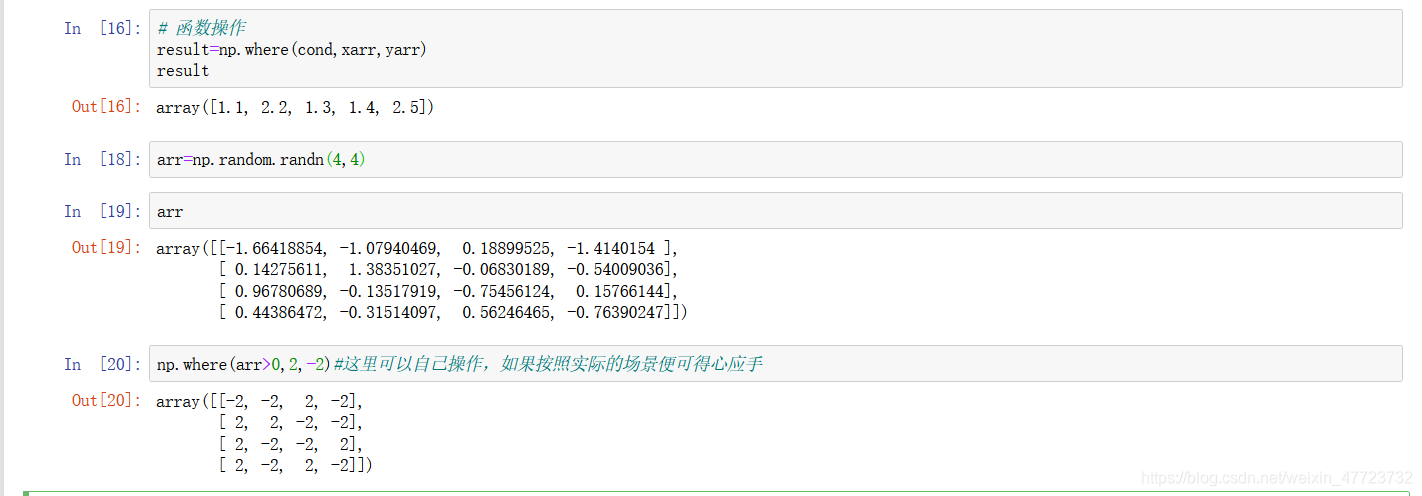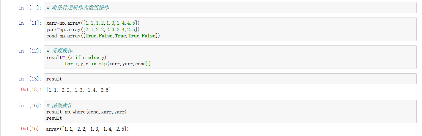 numpy.where函数是三元表达式 x if condition else y 的向量化版本,假设我们有一个布尔值数组和两个数值数组