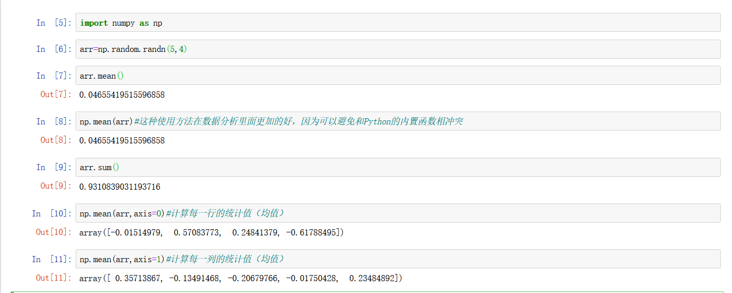 许多关于计算整个数组统计值或关于轴向数据的数据函数,可以作为数组类型的方法被调用。你可以使用聚合函数(通常也叫缩减函数),比如sum,mean,STD(标准差)既可以直接调用也可以使用顶层的numpy函数