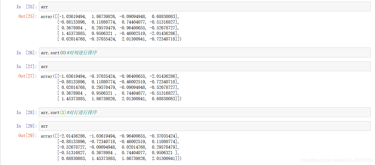 和Python类建列表相似,numpy数组可以使用sort方法按照位置排序