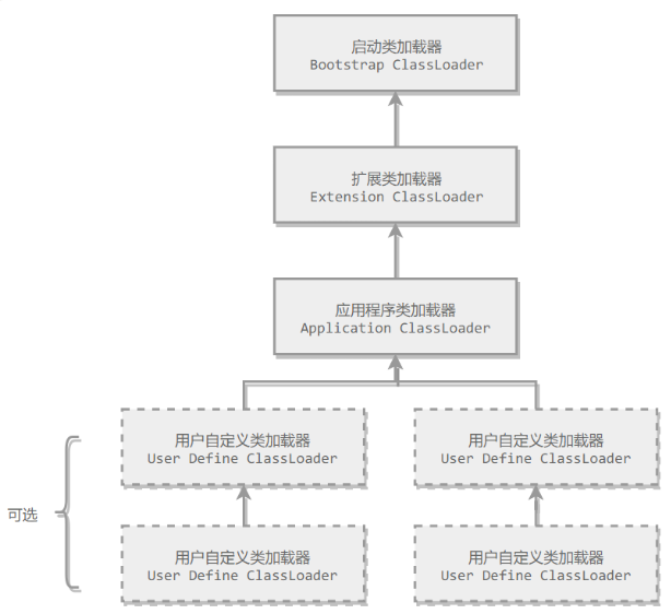 JVM 中内置了三个重要的 ClassLoader,除了 BootstrapClassLoader 其他类加载器均由 Java 实现且全部继承自java.lang.ClassLoader: