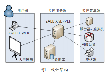现阶段平安银行广州分行应用Zabbix系统搭建的监控平台主要用于监控服务器、虚拟机、网络设备以及各类哑终端,设计架构如图1所示。
