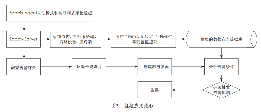 通过配置告警媒介,启用邮件告警类型,利用SMTP服务根据告警类型创建触发器,并设置相对应的事件响应接收人。同时,通过Python二次开发捕获告警数据,实现企业微信进行微信短信息告警。监控应用流程如图2所示。