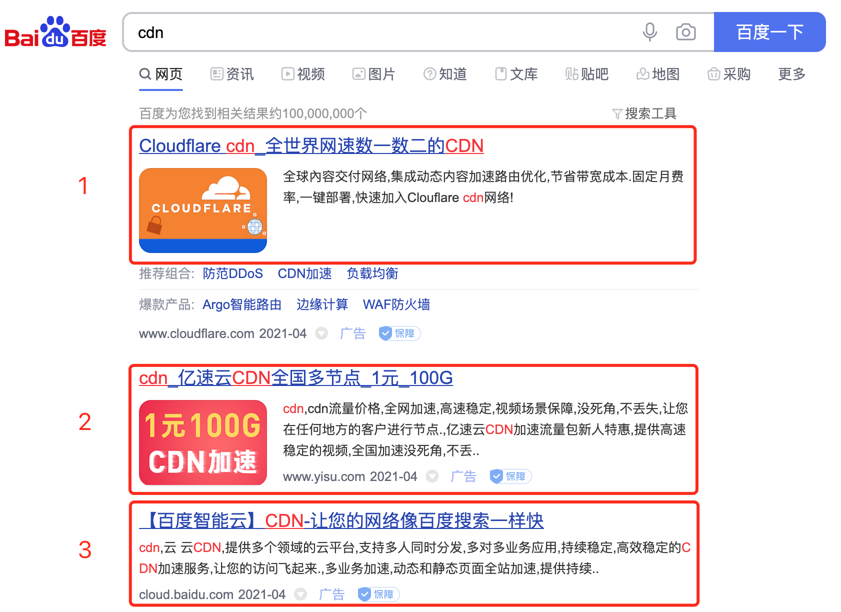 当我们在百度上搜索 cdn 关键字时,搜索结果会如上图所示。