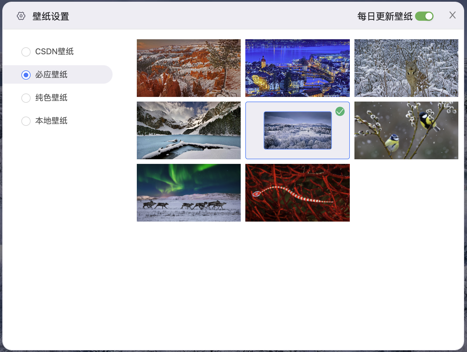 同时,支持壁纸图片的管理,一共有四大类壁纸:“CSDN壁纸”、“必应壁纸”、“纯色壁纸”、“本地壁纸”。其中,“本地壁纸”支持自定义背景图片,非常人性,给产品经理点赞👍。
