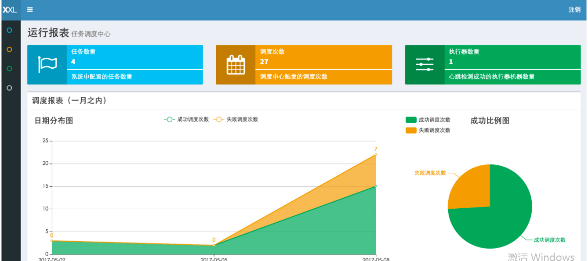 - 29、运行报表:支持实时查看运行数据,如任务数量、调度次数、执行器数量等;以及调度报表,如调度日期分布图,调度成功分布图等;