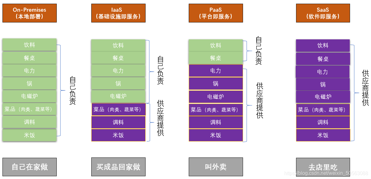IaaS:买成品(米饭、调料和菜品已经搭配好),带回家用自己的厨具来制作;