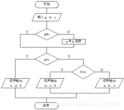 【实例2.3】 从键盘中输入3个数分别赋给a、b、c,要求按大小顺序把它们打印出来。流程图如图所示