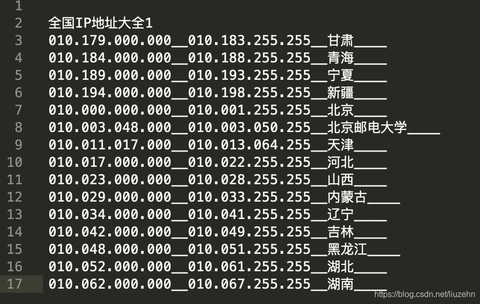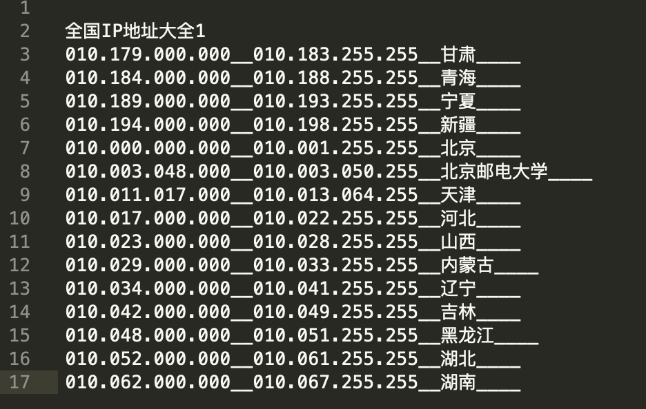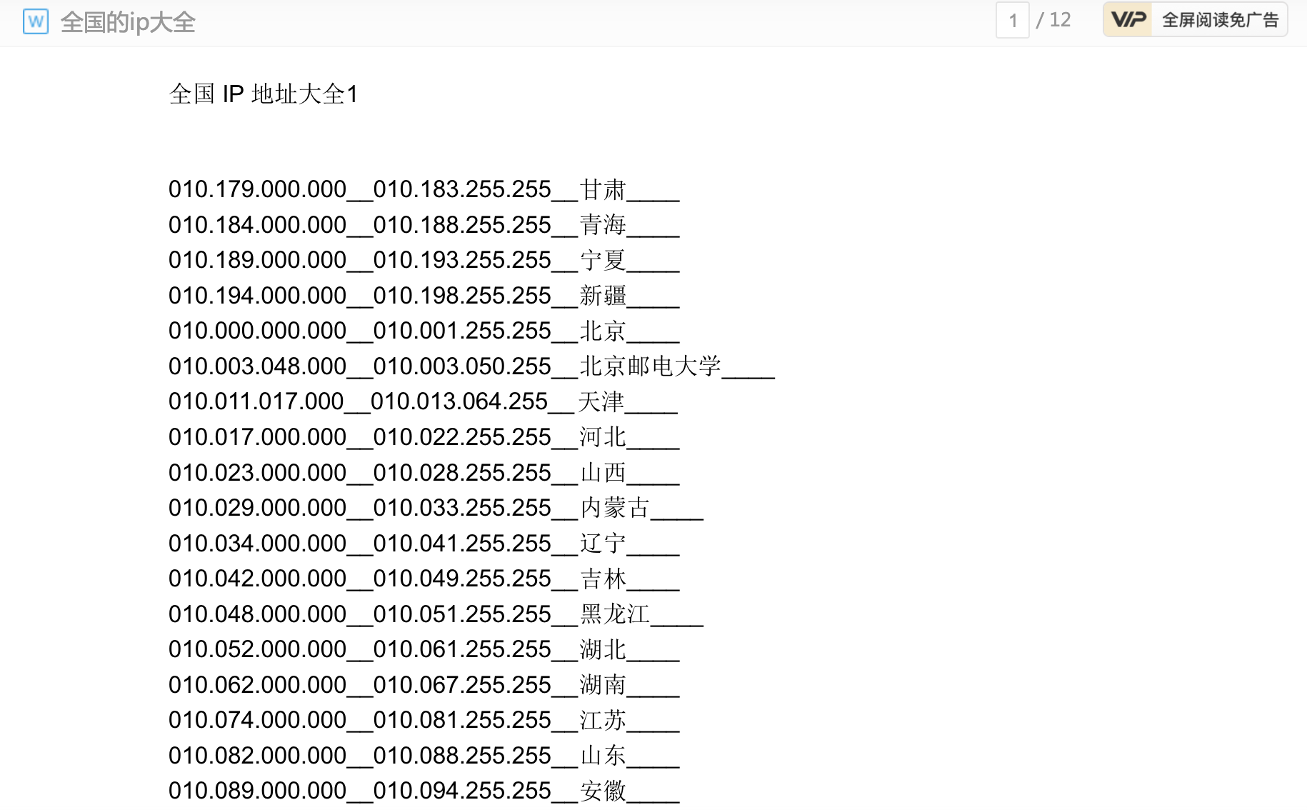 比如,我想搜索全国的IP地址库,搜索到的文档内容如下图所示: