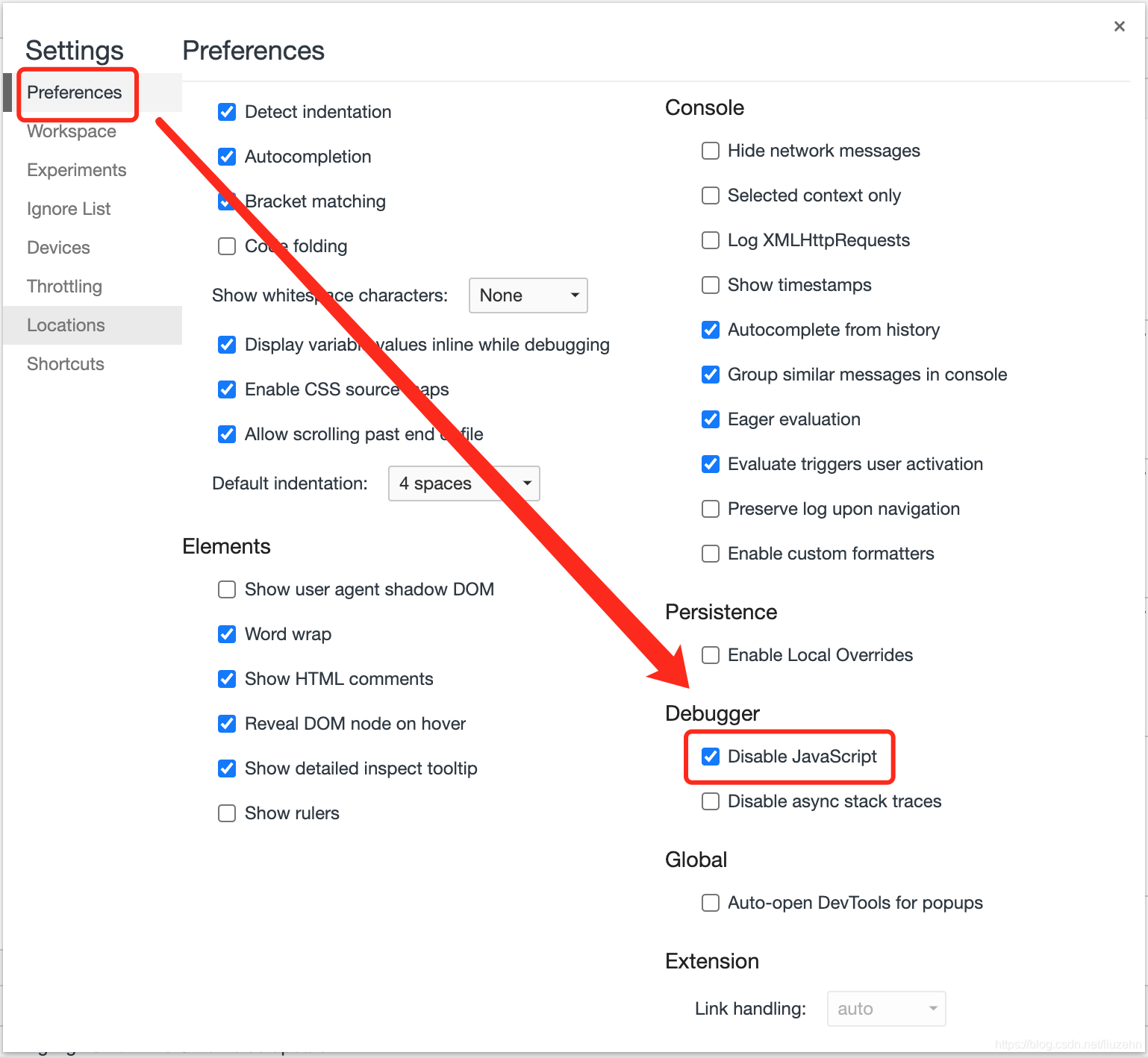 具体操作也是先打开网页的“开发者模式”,点击右上角的“设置”,在设置页面中,选择“偏好设置”(Preferences),选择“调试器”(Debugger),勾选“禁用JavaScripte”,具体操作如下图所示: