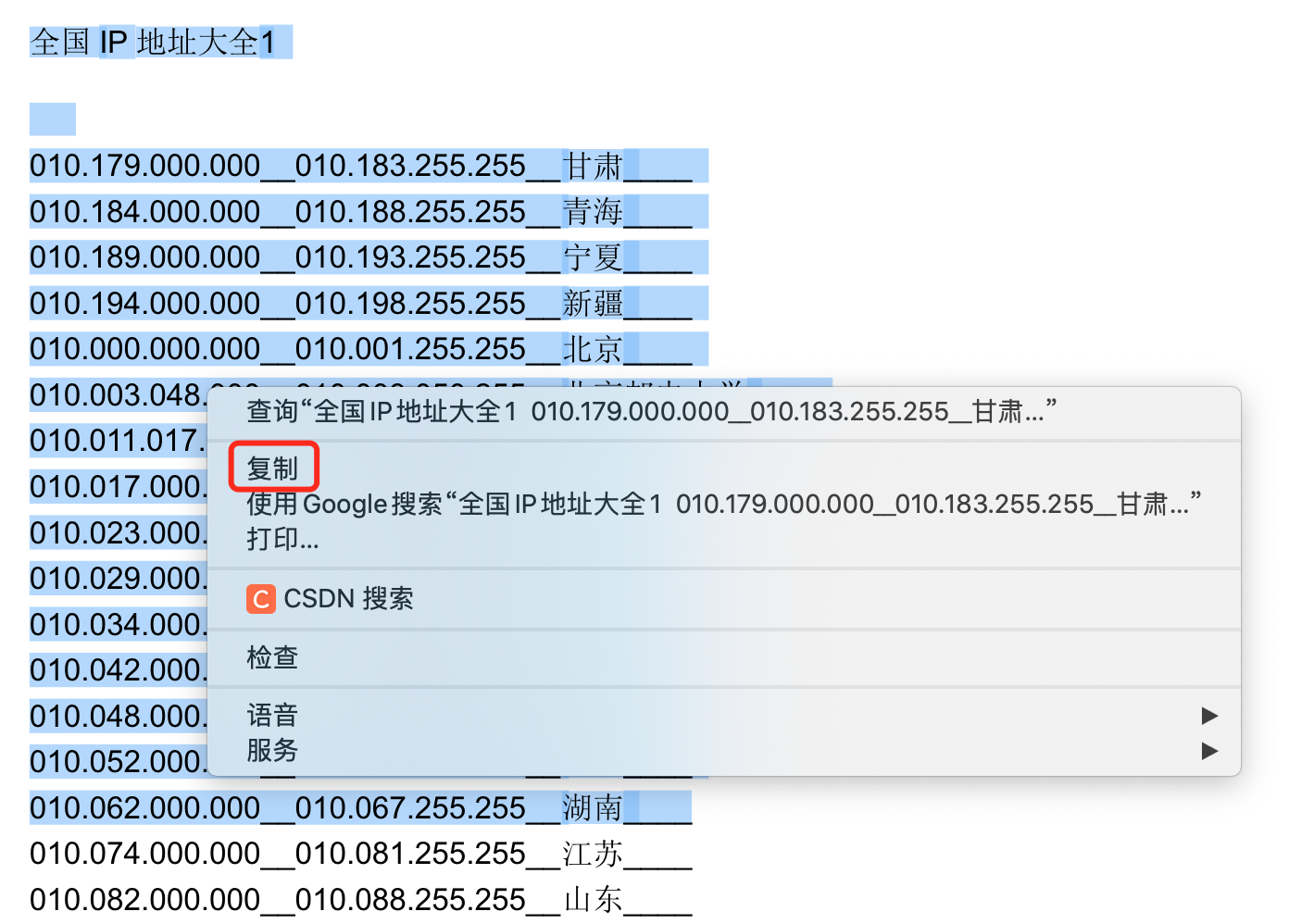 但是这种方式的缺点也是显而易见的,我们每次只能复制一部分内容,比如IP段和位置区域需要分别复制。